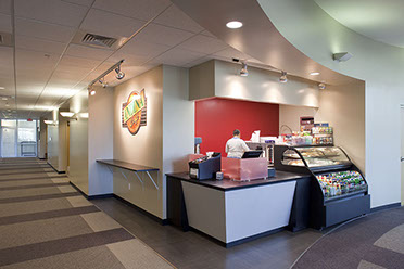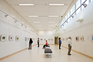 Needed space for growing programs was captured by filling in the “doughnut hole” on the roof of the first floor of the library structure. The 6,000 square foot addition contains the L.I.N.C. Center, an internet and gaming room with 48 computer stations, and an exhibit space. The Exhibit Hall is a flexible area that showcases traveling exhibitions and hosts receptions. The roof of the addition rises above the existing roofline, providing opportunities for a variety of clerestory lighting strategies. Exhibition requirements dictated that all natural light be strictly controlled. A new coffee bar was included, adding a comforting amenity for patrons.