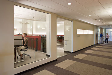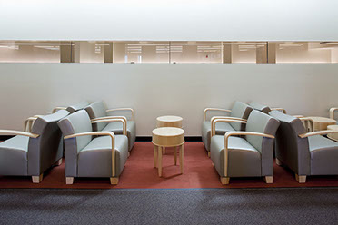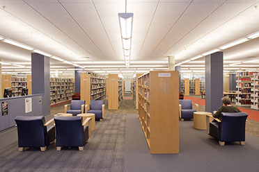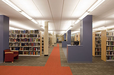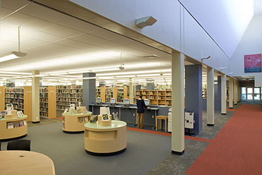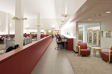 After inserting columns through the roof by crane into the first floor space, a major renovation of the first floor reading room was fortuitously required. The 6,000 square feet of existing library space was remodeled to provide a well lighted and inviting reading room. All new lighting, finishes, furnishings, e-mail stations, and display space complete the renovation. Care was taken to establish a new, clean aesthetic for the library to reflect its modern aspirations.