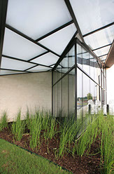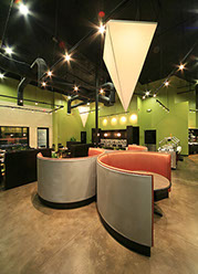 A sculptural free-standing canopy covers the restaurant’s entry and serves as the building’s billboard during the day as well as at night. Based on the Chinese art of paper folding (the predecessor of origami), the translucent cover communicates a complexity of meanings—shelter, transparency, light, and entry. Accompanying forms become a backdrop for the oversized glass cover. Minimal use of color with emphasis on linear elements and voids continues into the tenant space. Simple functions become sculptural elements within the box—geometric light fixtures, curved booths, square boxes for private dining. The use of exterior materials inside allows the user a different experience of the exterior textures, lights and voids, yet provides an uninterrupted journey from the car to their table.