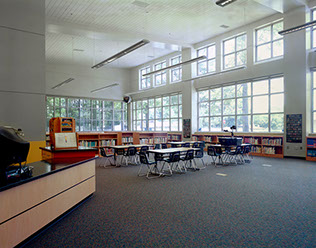 To maximize physical and visual access to the space, the media center was placed at the intersection of the two nearby streets. Large windows allow pedestrians to see into the high-tech space while perforated metal panels reduce glare. Exterior materials consist of patterned brick in three muted colors and stucco on the parapet. The subtle variation in brick tones allows for the articulation of building elements and breaks up the monolithic appearance of long walls. Metal awnings were employed to control the sun so that all classrooms could benefit from natural light.