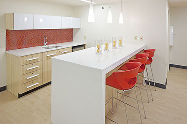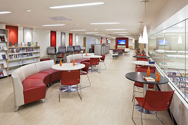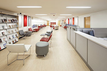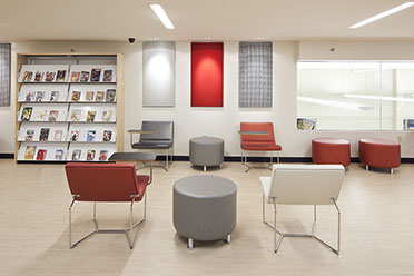 The chosen design solution incorporates large unobstructed glazed openings to the floor below, providing for visual monitoring and a feeling of openness. The long linear space was partially divided to mitigate the tunnel effect, and to provide defined areas for reading, completing homework, accessing computers, and gaming. Linear lighting fixtures perpendicular to the length of the room, vertical fabric panels, and a monochromatic color scheme were employed to obscure the limited ceiling height and strengthen the visual width. Clear, intense color accents were critical to the success of the project, as was the incorporation of state-of-the-are technology. Dual flat screen televisions are posititioned for competitive video gaming, and televisions, lounge seating, and a kitchenette can be utilized for weekly movie nights. Additionally, L-shaped custom riser seating allows the space to be used for children’s story time.