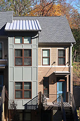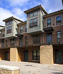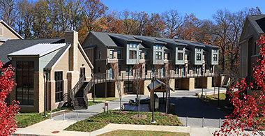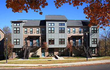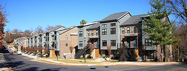 Allison with Little Diversified Architectural Consulting planned and designed the Duncan Avenue Apartments to meet the University of Arkansas’s sustainability requirements, and the project is the first Green Globes Level 2 facility on the Fayetteville campus. The site for the apartments presented an outstanding opportunity to create a residential complex that enriches the urban fabric of Fayetteville and preserves an unspoiled sliver of the natural environment. Direct street access to each unit creates activity along the street, while the rear of the buildings opens to a natural area, planted with native species, and the adjacent wooded site. The Community Building, which houses a manager’s office and community room, is pulled away from the street edge, creating a courtyard within the site. Some of the sustainable features of the apartments include the use of a previously developed site, access to natural light and ventilation, energy efficient fixtures throughout, and close proximity to the center of campus with access to city trails and public transportation.