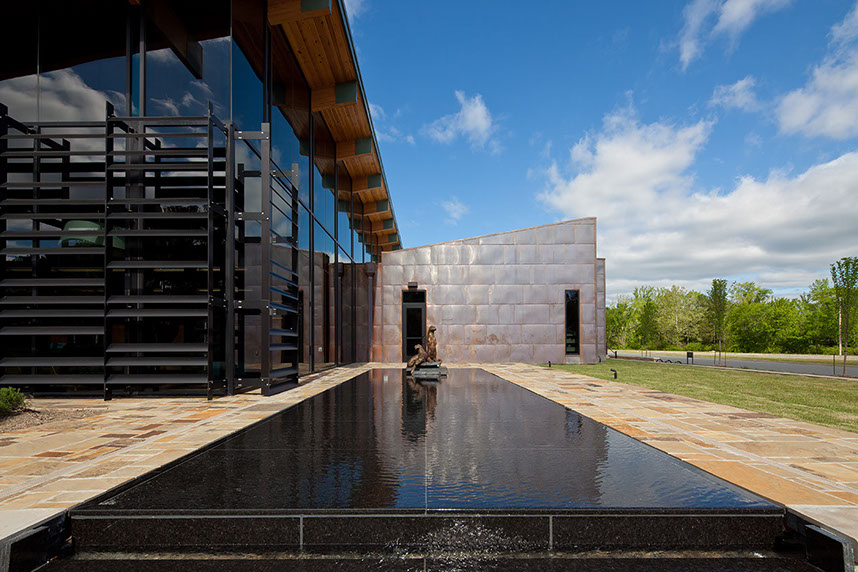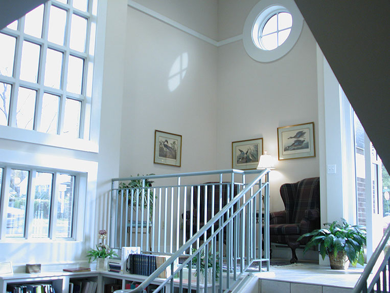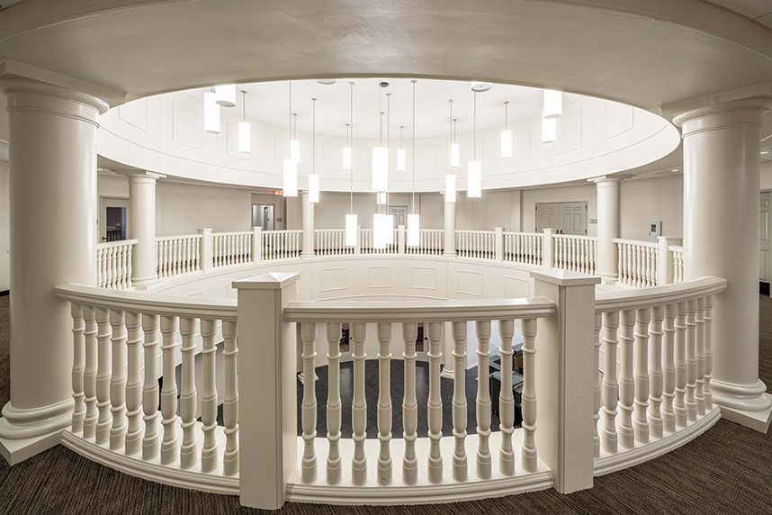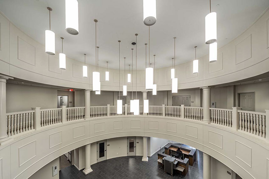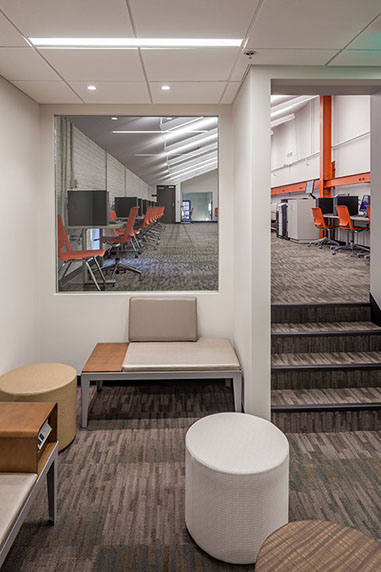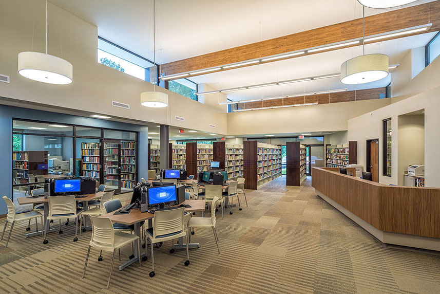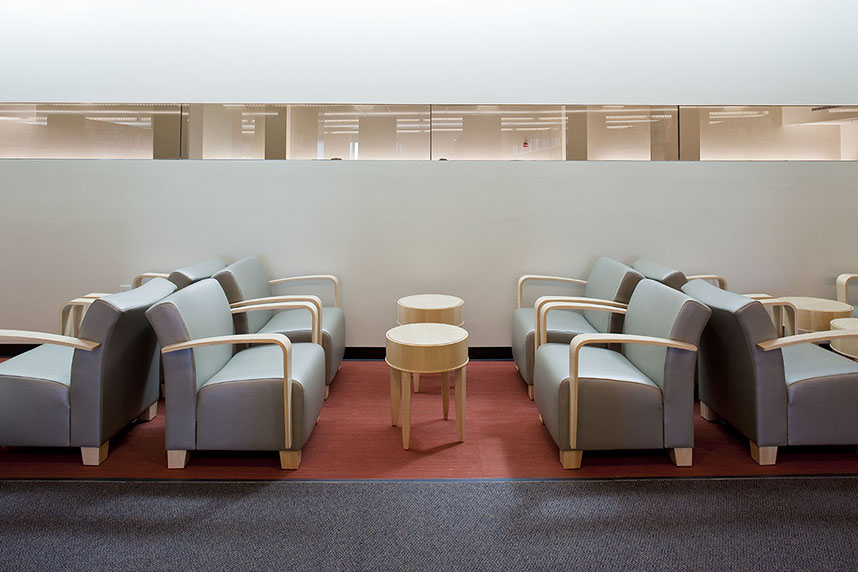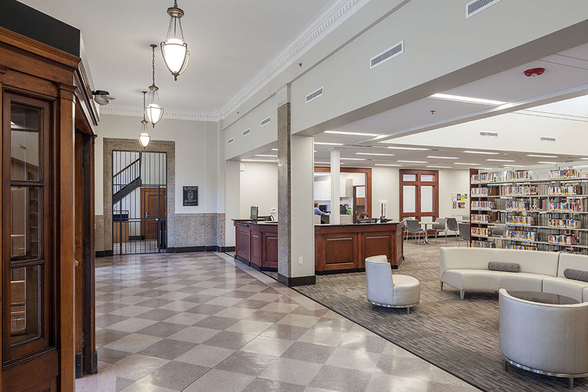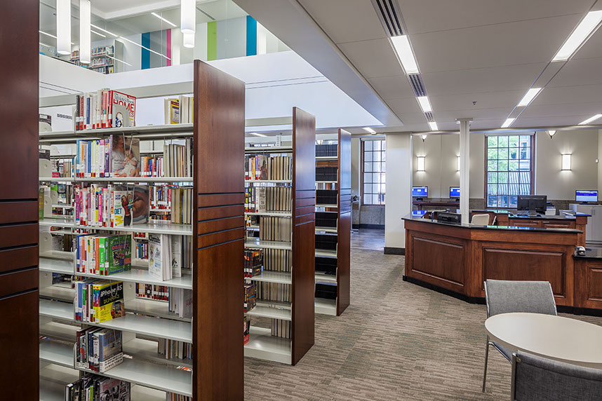 After inserting columns through the roof by crane into the first floor space, a major renovation of the first floor reading room was fortuitously required. The 6,000 square feet of existing library space was remodeled to provide a well lighted and inviting reading room. All new lighting, finishes, furnishings, e-mail stations, and display space complete the renovation. Care was taken to establish a new, clean aesthetic for the library to reflect its modern aspirations.