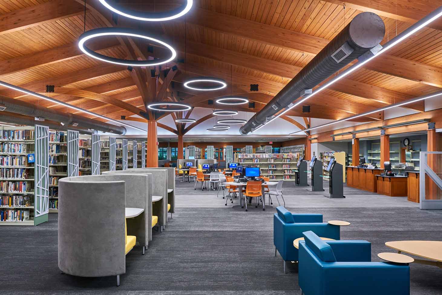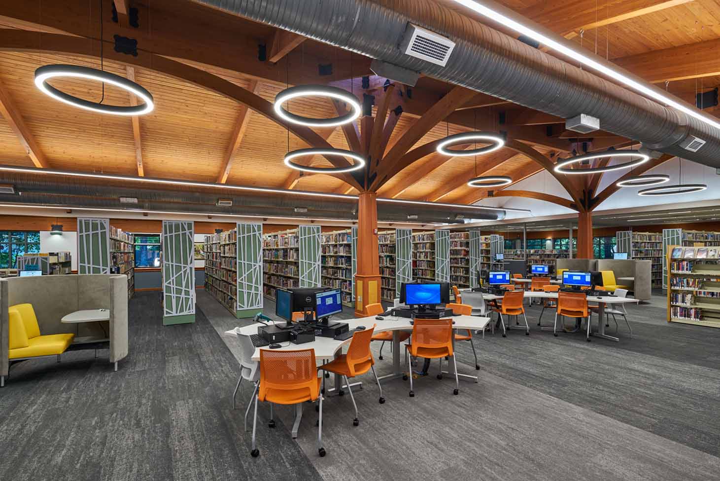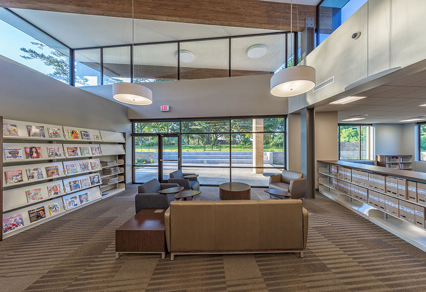 Needed space for growing programs was captured by filling in the “doughnut hole” on the roof of the first floor of the library structure. The 6,000 square foot addition contains the L.I.N.C. Center, an internet and gaming room with 48 computer stations, and an exhibit space. The Exhibit Hall is a flexible area that showcases traveling exhibitions and hosts receptions. The roof of the addition rises above the existing roofline, providing opportunities for a variety of clerestory lighting strategies. Exhibition requirements dictated that all natural light be strictly controlled. A new coffee bar was included, adding a comforting amenity for patrons.