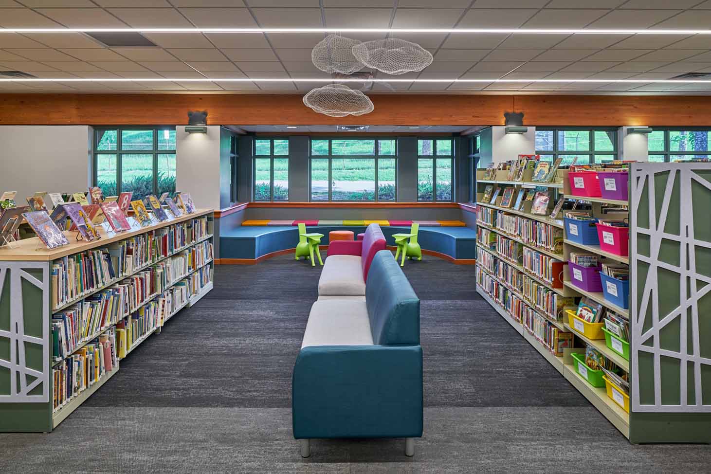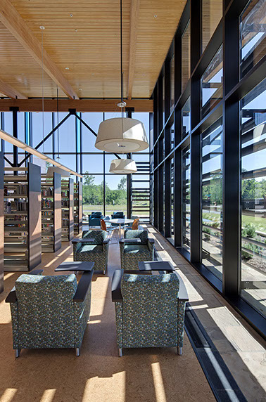 Each branch library in the Central Arkansas Library System is uniquely designed for its neighborhood, and the Oley E. Rooker Branch reflects its location, culture, and the community’s interest in sustainability. Sited along Stagecoach Road near the main entrance to Otter Creek, the new library will provide a memorable landmark for the community and is the first LEED certified facility for CALS. The design incorporates many sustainable strategies, including a geothermal heating and cooling system that takes advantage of energy naturally found on-site; efficient landscaping practices, such as catch basins to clean and infiltrate water on-site; and specification of both regional and rapidly renewable materials. Local building materials include stone, copper, wood, and glass. Laminated wood beams form a large, sheltering roof while transparent glass walls and large windows not only welcome passersby by allowing them to see activity within, but also provide a connection between interior spaces and the outdoors. The indoor environment is enhanced through views to the outside and abundant natural light. Cork and stone floors, wood, warm colors, and oversized hanging “lamps” along the perimeter add to the warm, inviting interior.