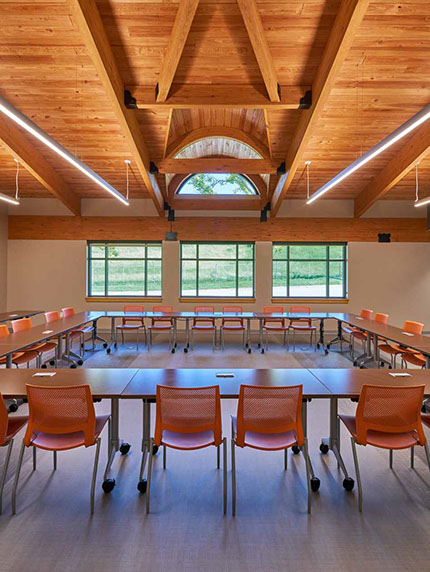 Hoke Lodge originally served as the camp caretaker’s house and later as the director’s house, in addition to providing storage space for the camp. The camp lacked a reception center and large meeting facility, so the underutilized Hoke Lodge was renovated to accommodate 120 occupants. Alterations to the building were confined to interior spaces, with only minor repairs to the exterior. The second floor that divided the entry space was removed, expanding the volume to create a more distinct entrance and allowing upper story windows to light arriving visitors.