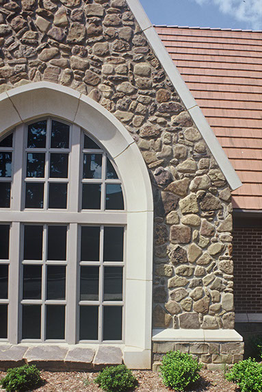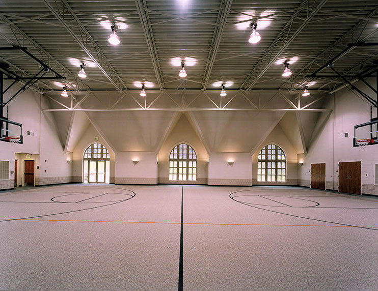 For ease of accessibility a bridge links the existing church with the new expansion, while cars pass under it to access the day care center on the lowest level. The multipurpose room on the second level matches the elevation of the adjacent sidewalk and allows walk in traffic from the street. In order to give the multipurpose/gymnasium room a pedestrian scale the façade and roof are broken into three distinct forms and covered in local Hackett stone and brick.
