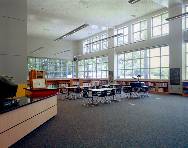 To maximize physical and visual access to the space, the media center was placed at the intersection of the two nearby streets. Large windows allow pedestrians to see into the high-tech space while perforated metal panels reduce glare. Exterior materials consist of patterned brick in three muted colors and stucco on the parapet. The subtle variation in brick tones allows for the articulation of building elements and breaks up the monolithic appearance of long walls. Metal awnings were employed to control the sun so that all classrooms could benefit from natural light.