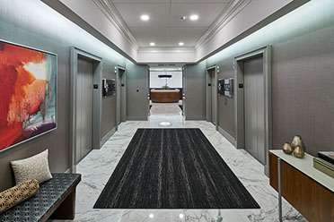 The owner of Frost, PLLC. desired to update a 1970’s traditional office and transform it into a contemporary space. This was accomplished by a complete renovation to the elevator lobby and reception area. Contemporary furniture, finishes, artwork, accessories and lighting were selected. The new layout of the space made way for a new conference room behind the receptionist area; the conference room features a wall of switchable glass which changes from clear to opaque at the flip of a switch. Corridors and offices on the entire floor received new carpet and wallcoverings.