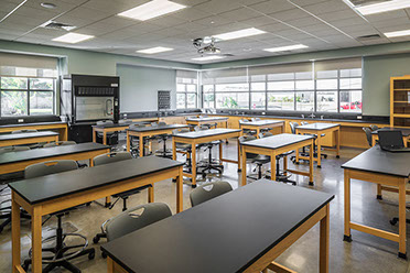 The building houses the entire nursing department including offices for faculty, computer and teaching labs with compressed video capabilities and nursing simulation labs. In addition, the new building also houses the science department including four new laboratories, supporting preparatory rooms and faculty offices and a greenhouse. The greenhouse includes fans, automatic venting, misting systems, heaters and shades. The greenhouse design and site location allows for future expansion.
