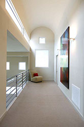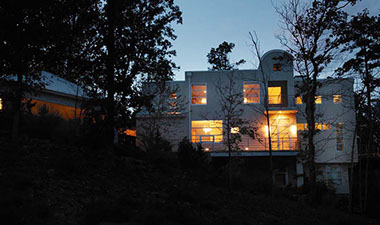 Sited on a sloping, irregularly shaped lot, the Cooper Residence takes full advantage of its wooded vistas. Simple shapes punctuated by a variety of openings create a composition of light and form. With exterior finishes of stucco and a commercial aluminum glazing system, it presents a simple, durable, and cost-effective façade to visitors. Displaying a proclivity towards clean, contemporary spaces, the clients desired an environment in which to showcase their growing art collection, yet maintain a warm and welcoming setting. Utilizing blonde woods and other natural materials, the rooms become filled with light for casual living and entertaining