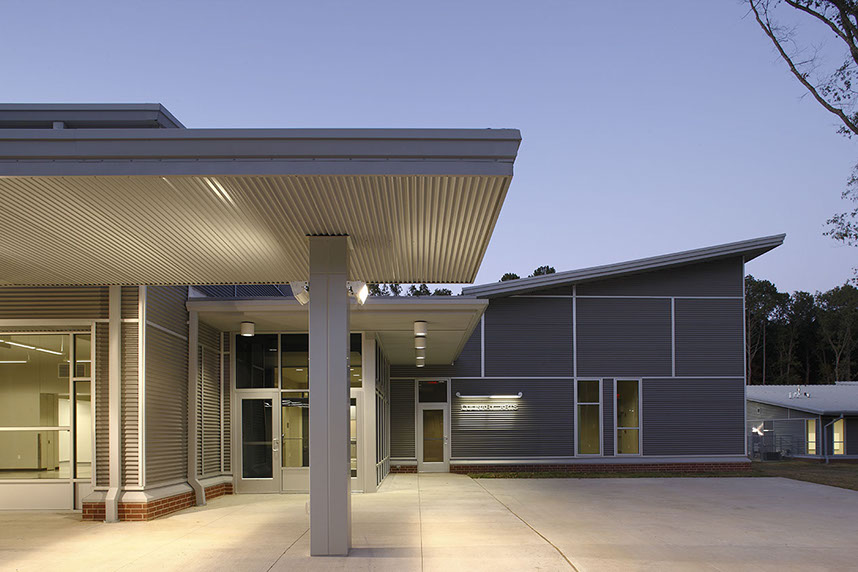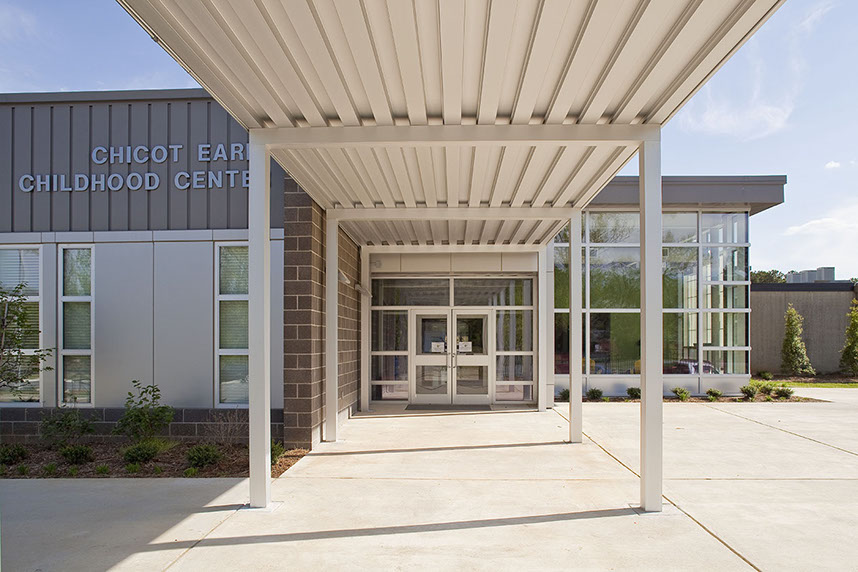 Chicot Primary is a twelve-classroom addition to the existing Chicot Elementary. With this addition, Chicot Elementary is converted from a K-6 to a PreK-2 facility. The new structure presents a strong positive image, which promotes ownership and pride by the neighborhood. An important design goal for the new building is to blend with the existing school building while projected an innovative and youthful image. Burnished concrete block in a palette of earth tones breaks down the large walls to provide a more child-friendly scale, and recalls the color of the concrete panels that make up the skin of the original school building. Metal panels in two colors sheath the projected classroom “boxes” and also help to break up the scale of the building. The entrance for the preschool is largely transparent to allow parents, children, and visitors to see into the colorful interior while using high performance materials and shading devices appropriate for its orientation. Other special features of the design include the box projections at each classroom that provide optional staging for learning activities, and observation rooms adjacent to four of the twelve classrooms. Natural daylight is maximized with an abundance of windows and insulated translucent roofing panels at the classroom projections. Also “monitor” structures on the roof with clerestory windows brings natural light into the hallways.