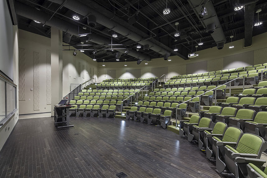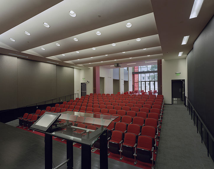 The new Hillside Auditorium is sited on the University of Arkansas’s campus between the historic Chi Omega Greek Theater and the Ferritor Hall and Science/Engineering buildings, facing Dickson Street. Intended to recede into the landscape, the building employs planted green roofs, which allow the continuation of the natural topography across the site and maintains the prominence of the Greek Theater at the top of the hill. Along with the vegetated roofs, an efficient exterior envelope, and high-efficiency building systems, Hillside Auditorium will meet or exceed established energy use standards and continue the University’s sustainability efforts. This new auditorium building replaced the aging Science and Engineering Auditorium and responds to the University’s current need for large-capacity classroom spaces. There are two auditoria in the building - one of mostly fixed seating for 455 persons with 32 loose seats, and a second of fixed seating for 290 persons. The building was designed to accommodate modest theatrical, spoken word, and musical performances and helps fill a niche not met by existing performance spaces found on campus. Intended to be the most visible portion of the building, an entrance and event pavilion, enclosed on three sides by high-efficiency glazing, is located on the uppermost-vegetated roof. The pavilion, which incorporates a catering kitchen, ample public seating, and gathering space, allows for expanded uses of the building and exterior spaces for special events. Entrances to the building at multiple levels and easy access across and through the site provide a connection between both Dickson Street and the nearby parking deck to the heart of campus. Allison teamed with Perry Dean Rogers Partners Architects on the project.